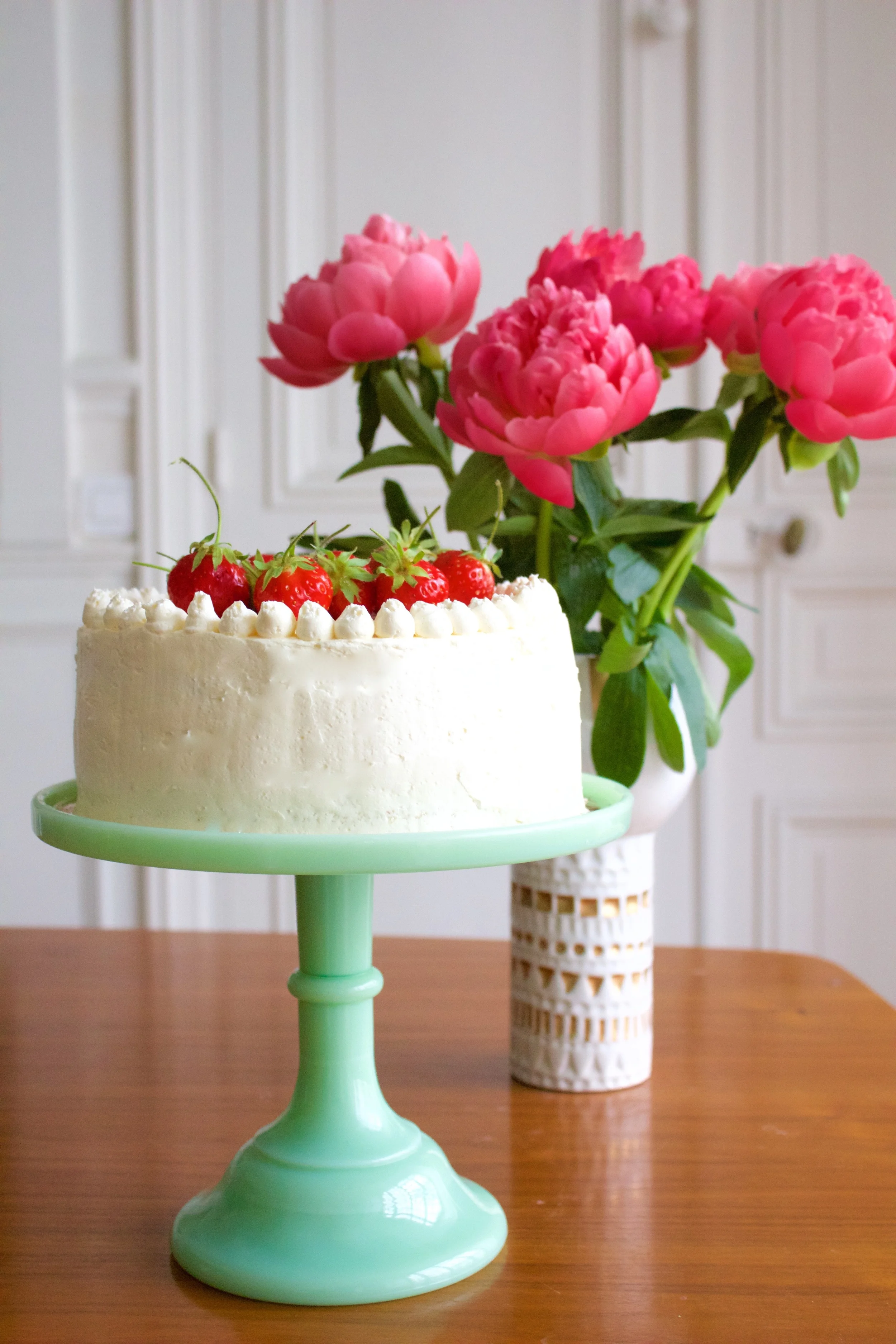 Vanilla cake with lemon curd filling topped with anaïs strawberries.