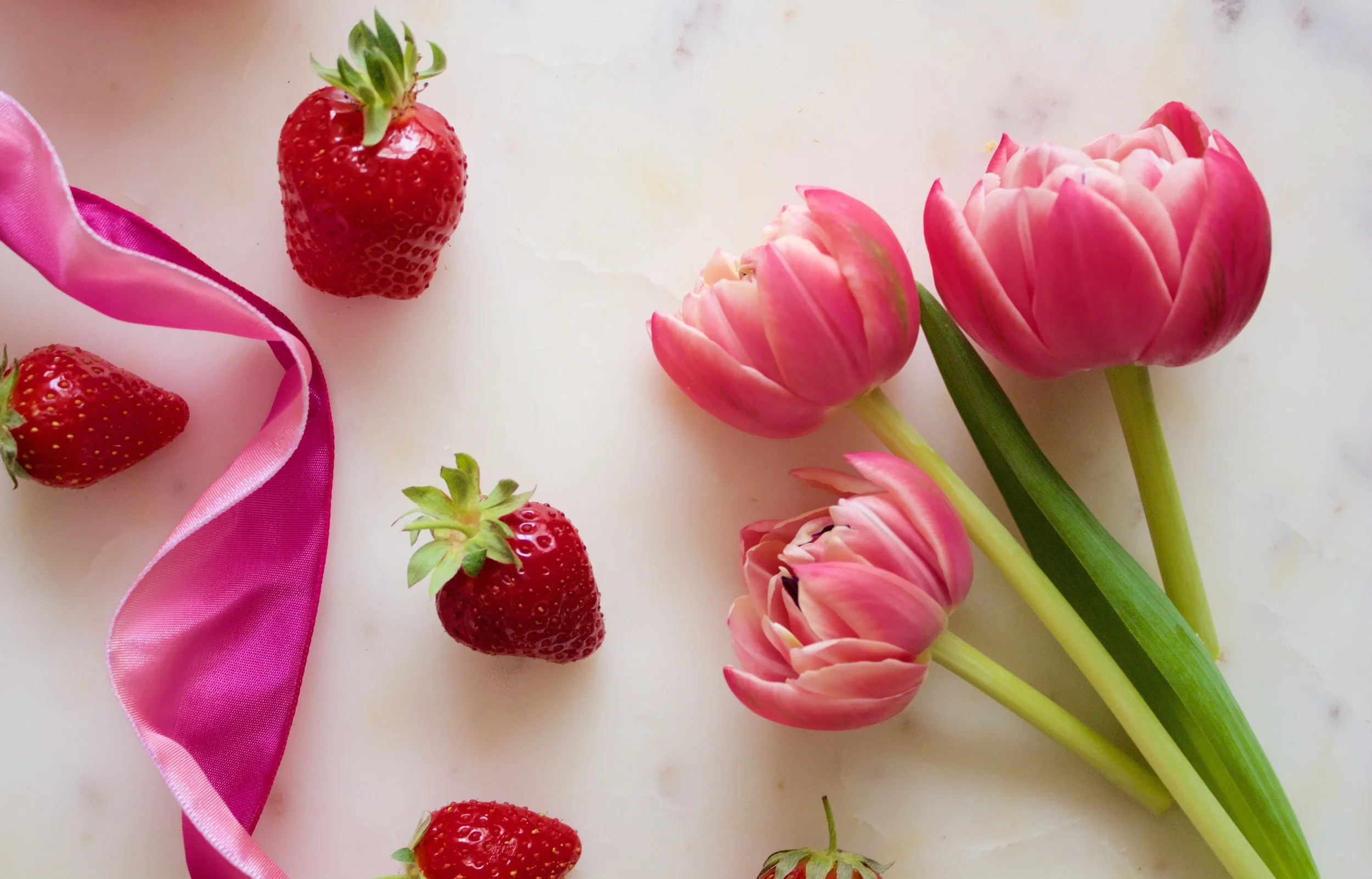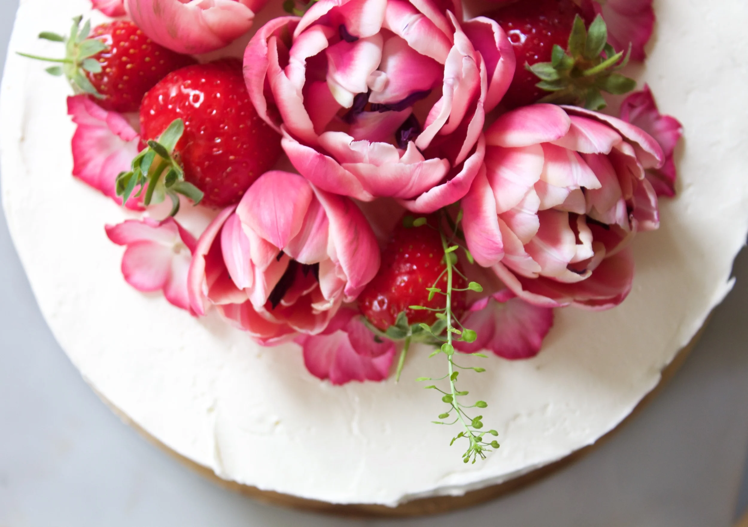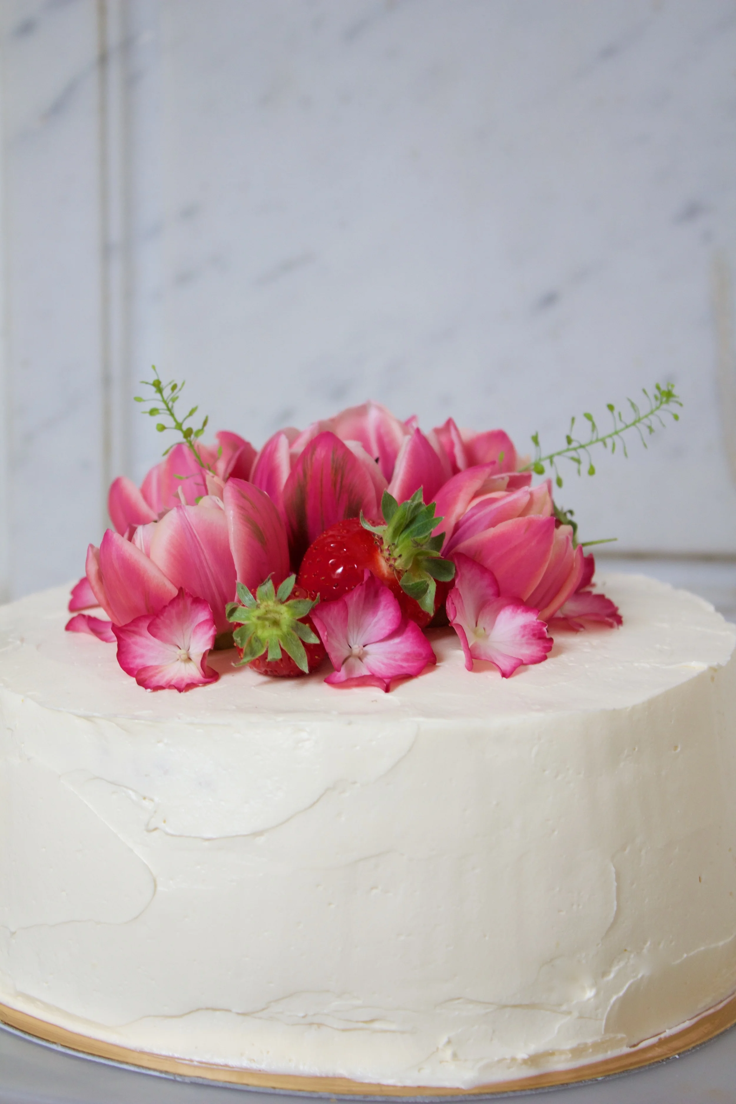 Strawberries and cream cake decorated with mara des bois strawberries and crystalized flower petals.