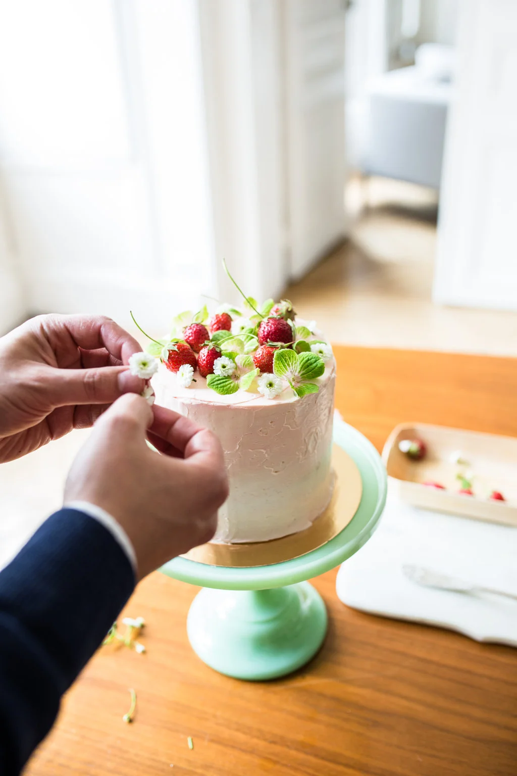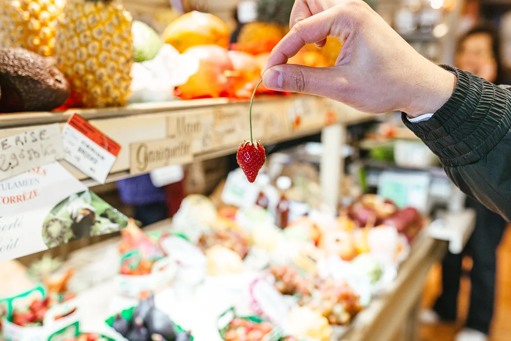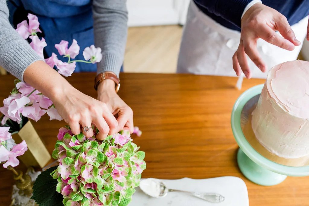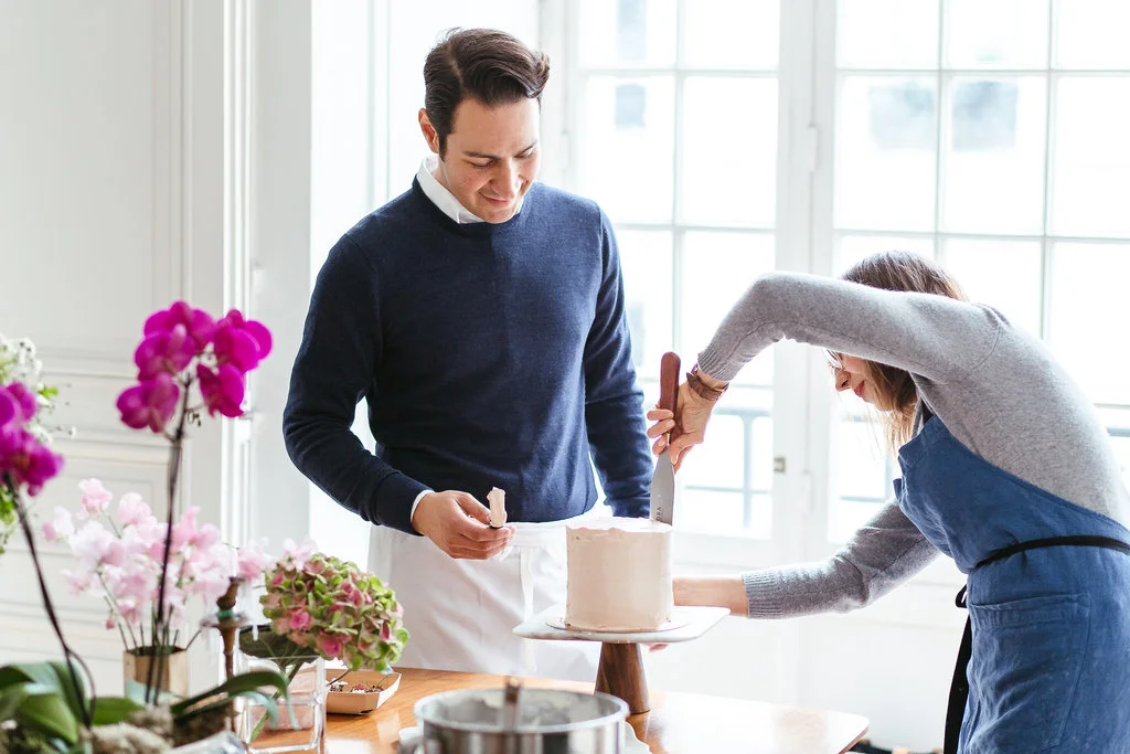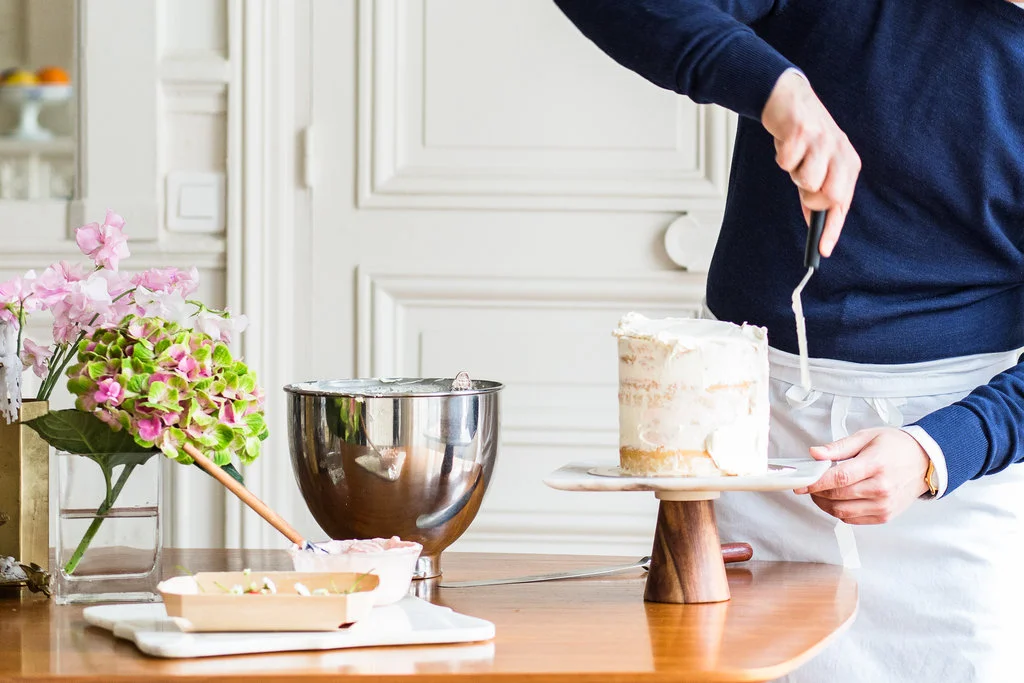 Last month I got to welcome back to town my beautiful cake sister, Jen Drew! Most of our time was spent wandering around Paris and cake-storming over coffee at our favorite cafés. We got up to lots of baking projects including this sweet little vanilla cake with strawberry buttercream. As it happens a friend from Switzerland was also in town to document a day spent foraging for ingredients at the markets and flower shops of Le Marais!