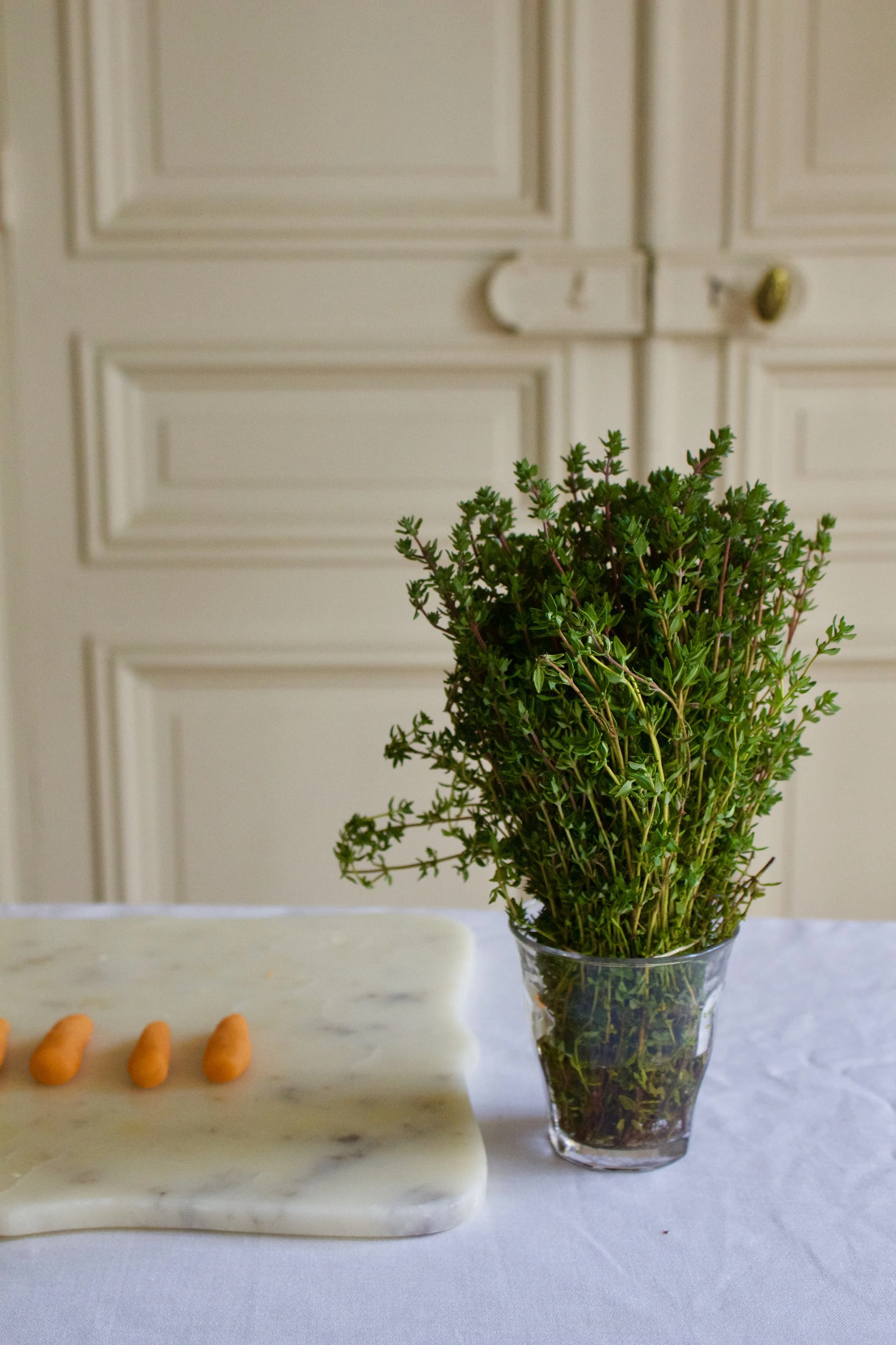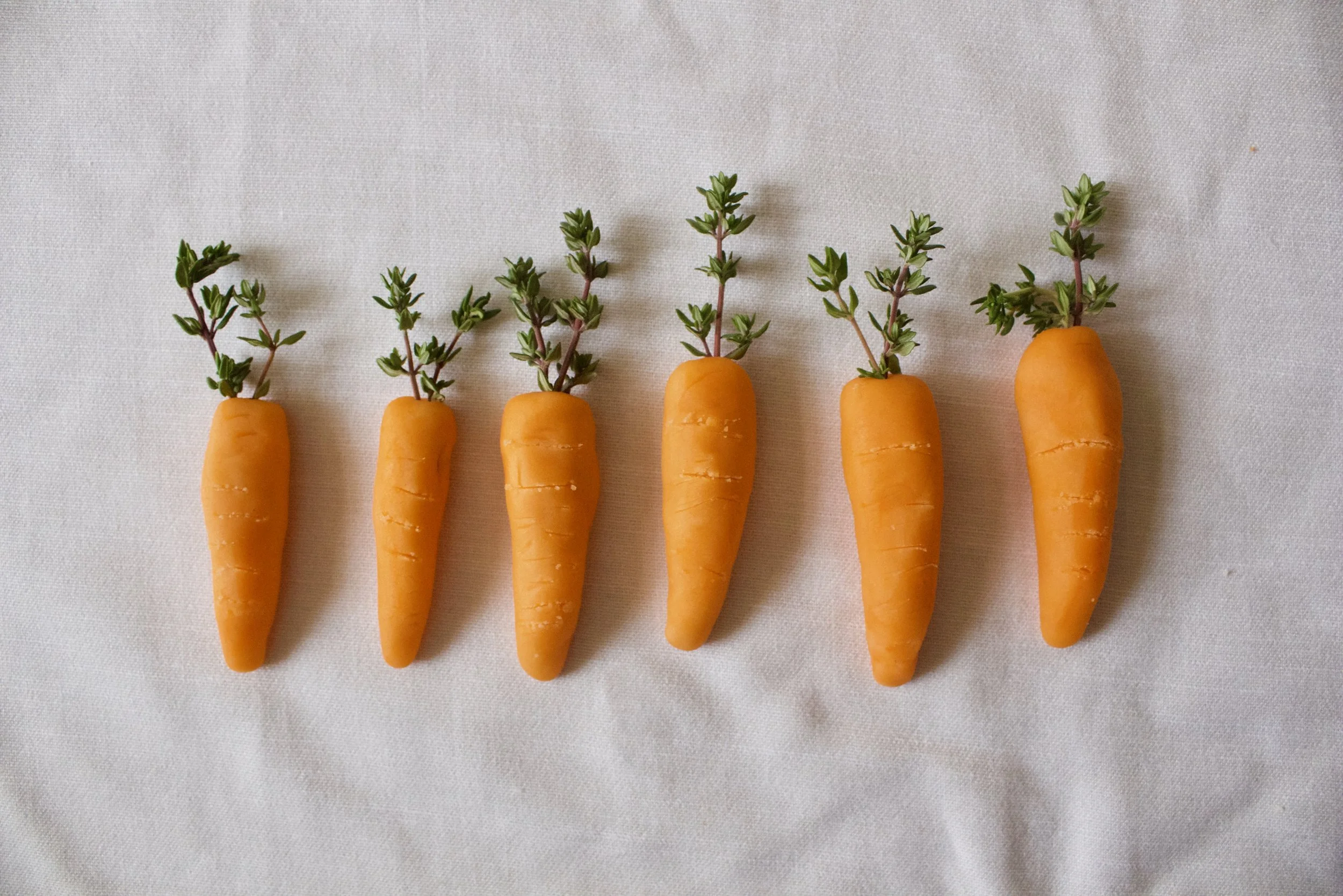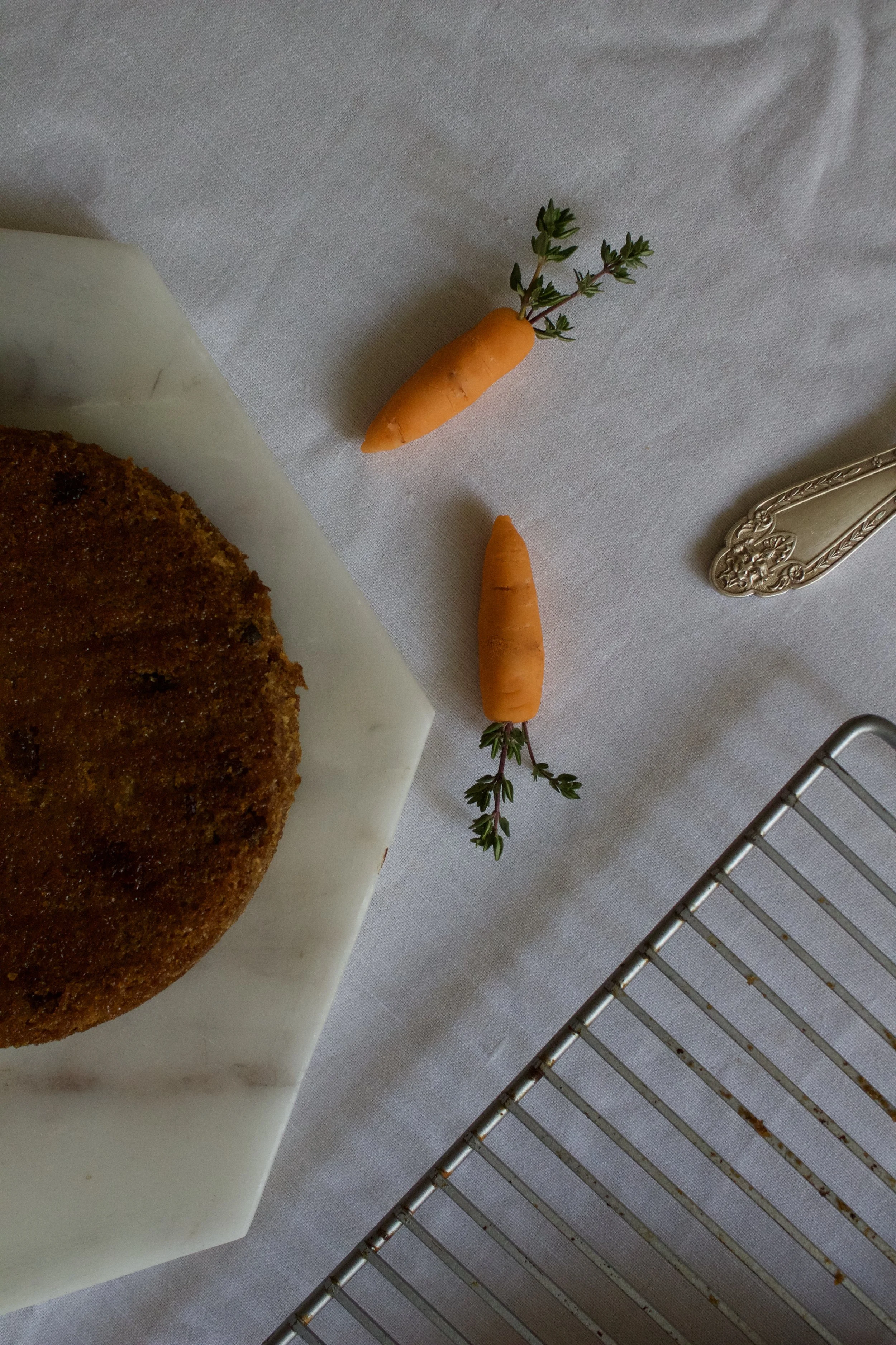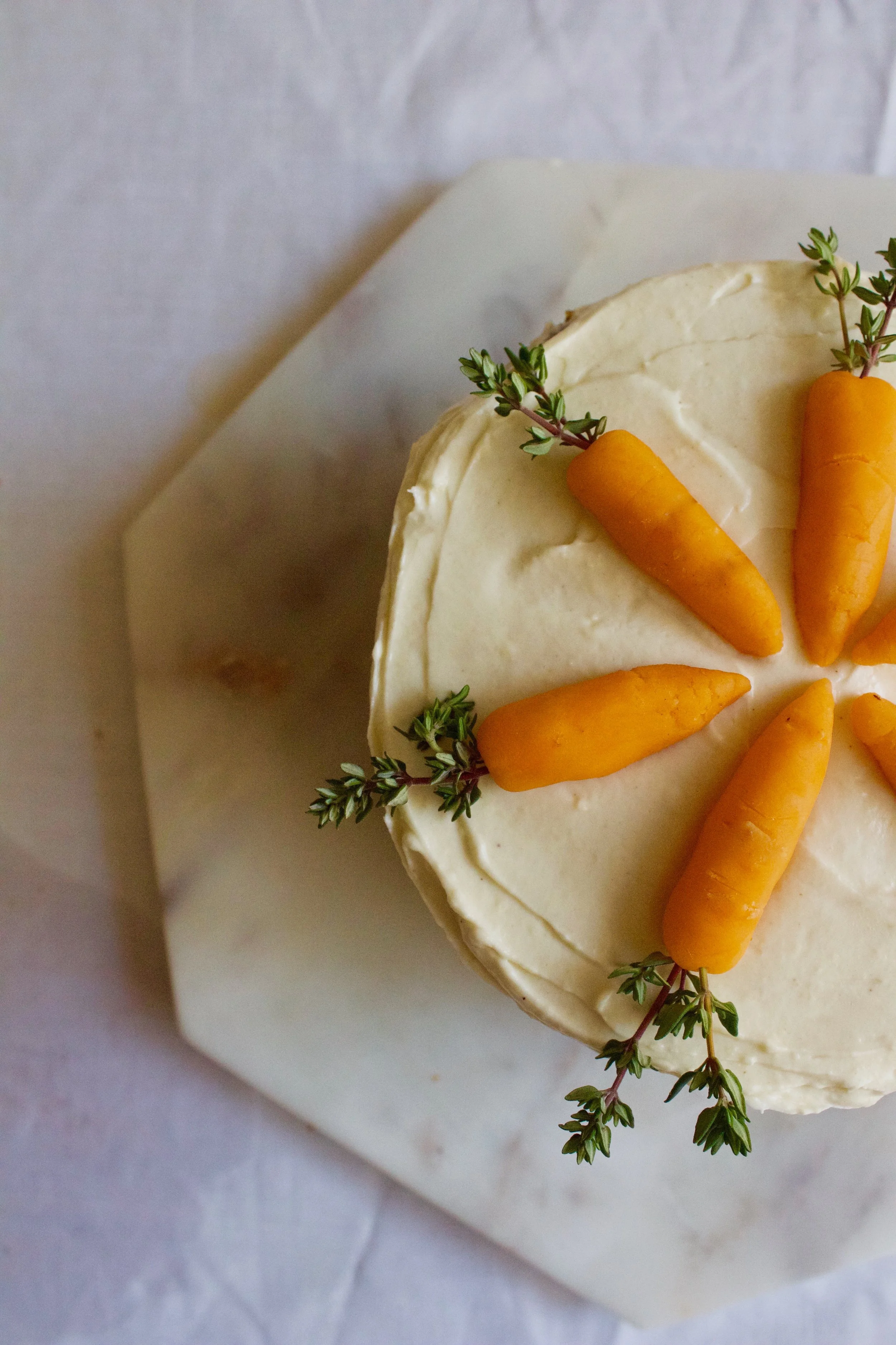 I had a lot of fun making some mini marzipan carrots for decoration based on a recipe I saw on Martha Stewart. I used sprigs of thyme for my carrot leaves and loved the effect. I did have a frustrating end to my carrot tahini cake test day: in a classic fit of bakers impatience, I made the mistake of trying to frost my cake rounds before they were fully cooled. I admit that I should know better by now, but I was so impatient to try the cake and photograph it that I threw caution to the wind. I think I was able to snap about three photos of the finished cake before the rounds started sliding in opposite directions! I decided to try and slice the cake immediately which resulted in gobs of frosting spilling out from all around the cake. It was a big tahini cream cheese mess but it tasted delicious nonetheless.