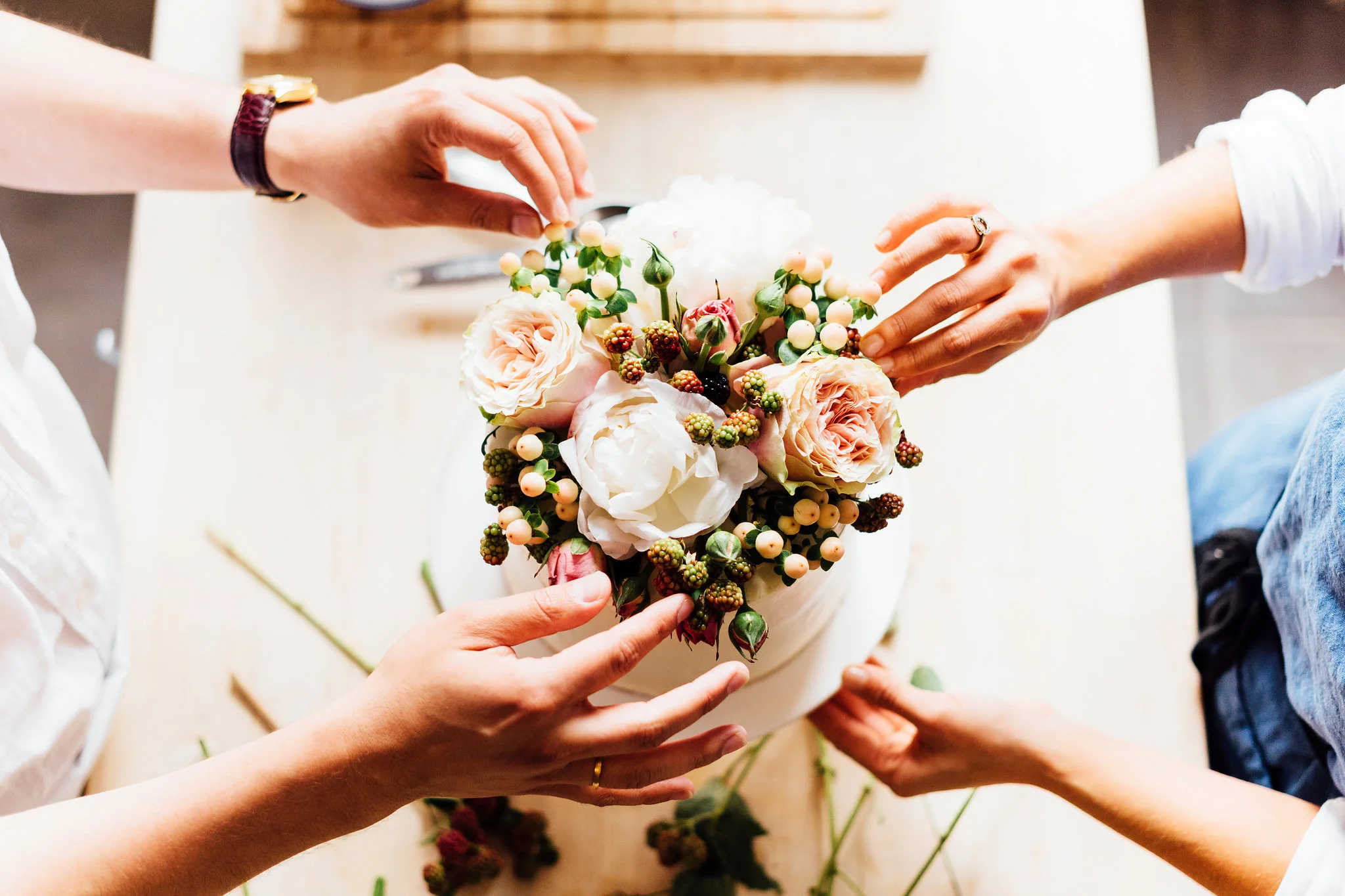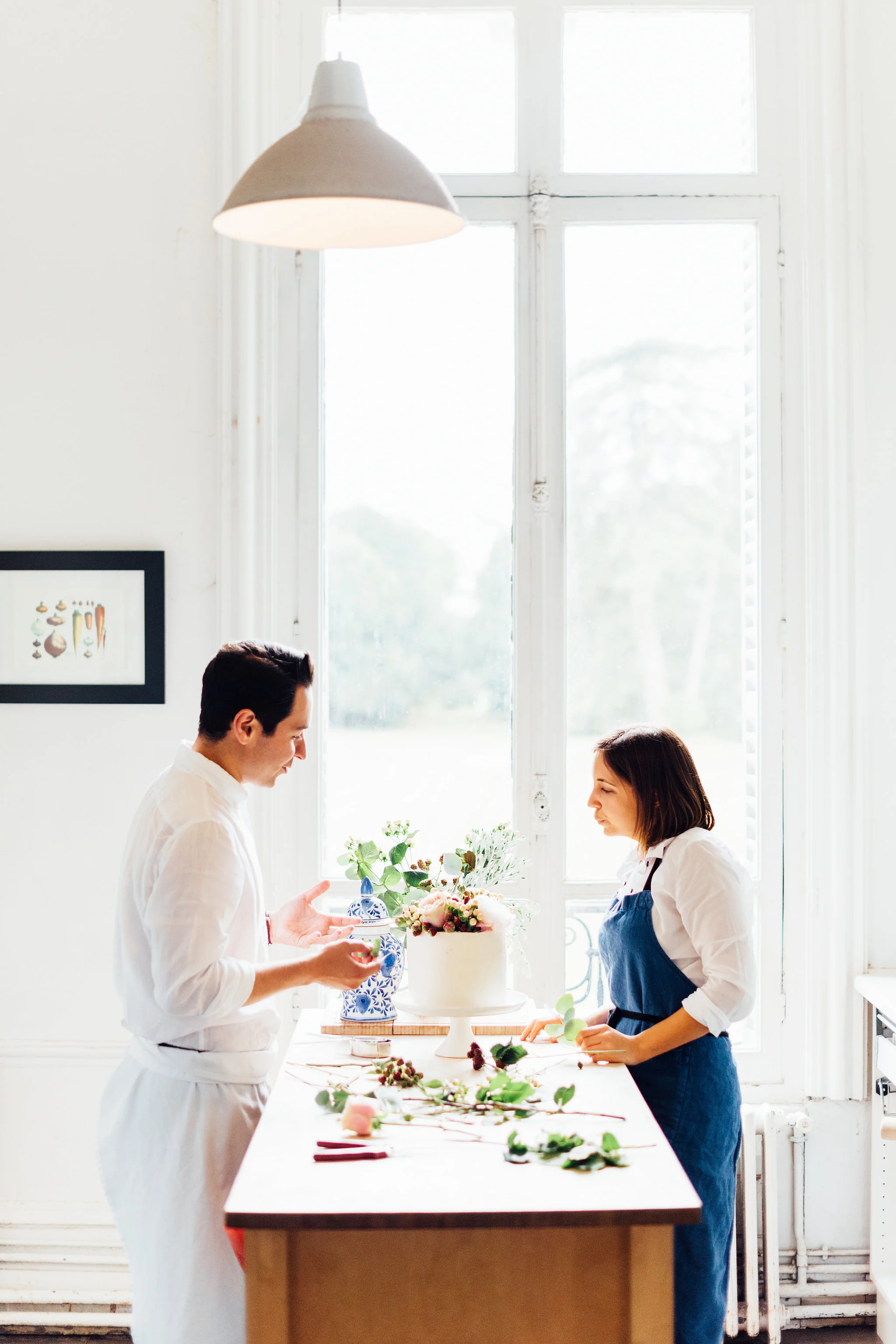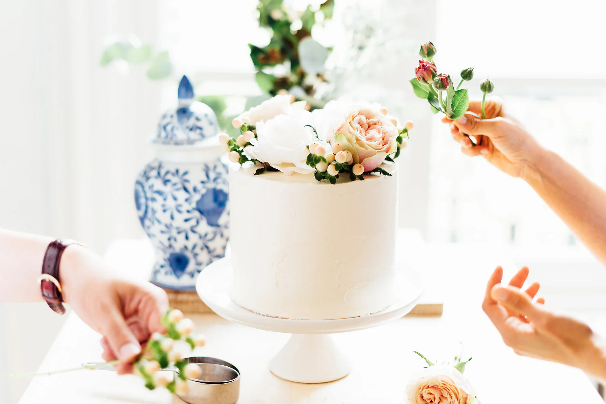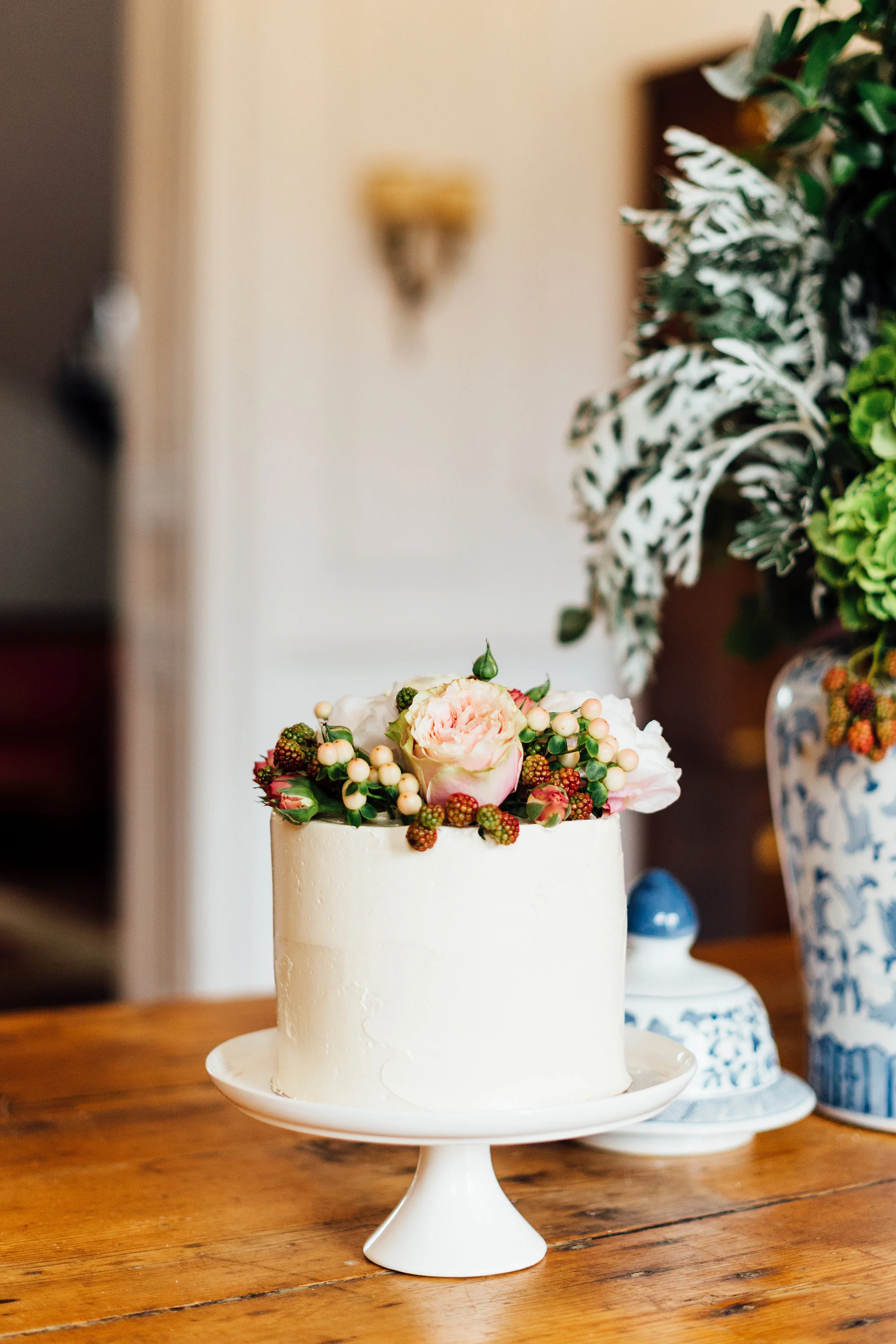 Meanwhile my Australian cake sister Jen and I were on baking duty in the kitchen making fresh passionfruit curd and heaps of Italian meringue buttercream. We wanted to make a simple yet elegant cake with three layers of vanilla sponge filled with passionfruit curd and raspberry jam. For decorations we discussed using wildflowers in a nod to the beautiful country setting.