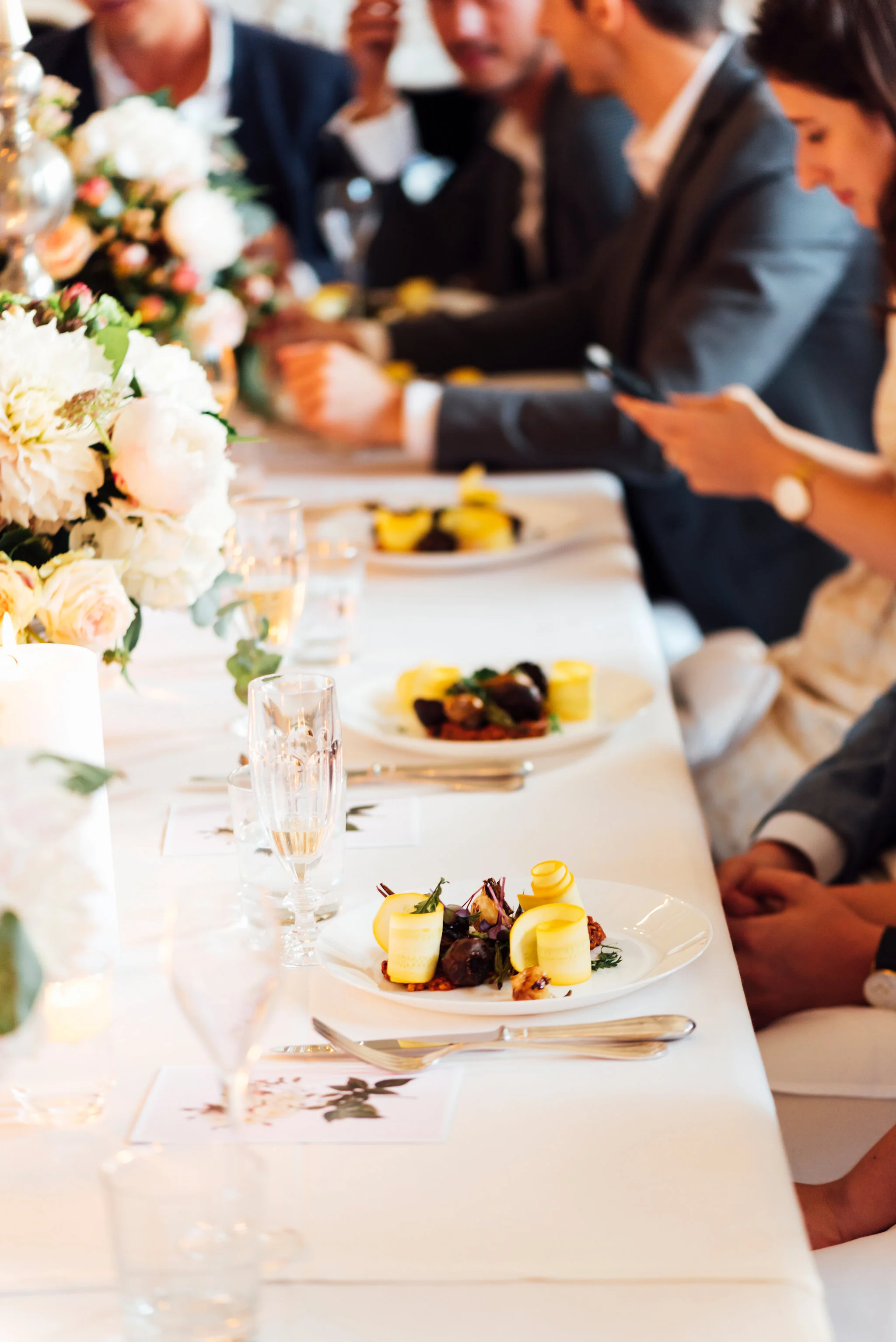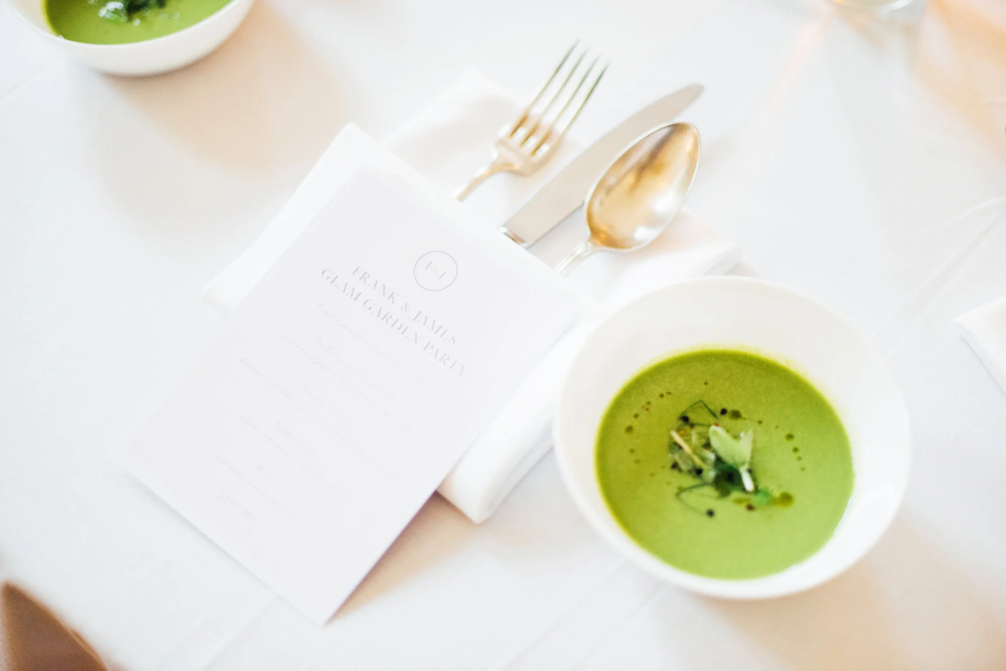 While we hob-nobbed upstairs, our chef was hard at work in the kitchens downstairs prepping all the lovely ingredients for the celebration dinner. Menus were designed by my friend Emily Sell of Paris based stationary studio, Ever After Press. We started with bowls of chilled sweet pea and sorrel gazpacho before moving onto grilled summer vegetables served with a red pepper almond tapenade. Guests were delighted when plates of Linda's signature salmon mi-cuit were brought out, served with herbaceous potatoes, fennel and light lemon aioli. In keeping with the summer garden theme we ended with a plate of grilled peaches, heirloom tomatoes and labneh. For dessert we started with a very pretty pavlova of wild berries in greek yogurt cream and finished with a midnight slice of that passionfruit curd cake.