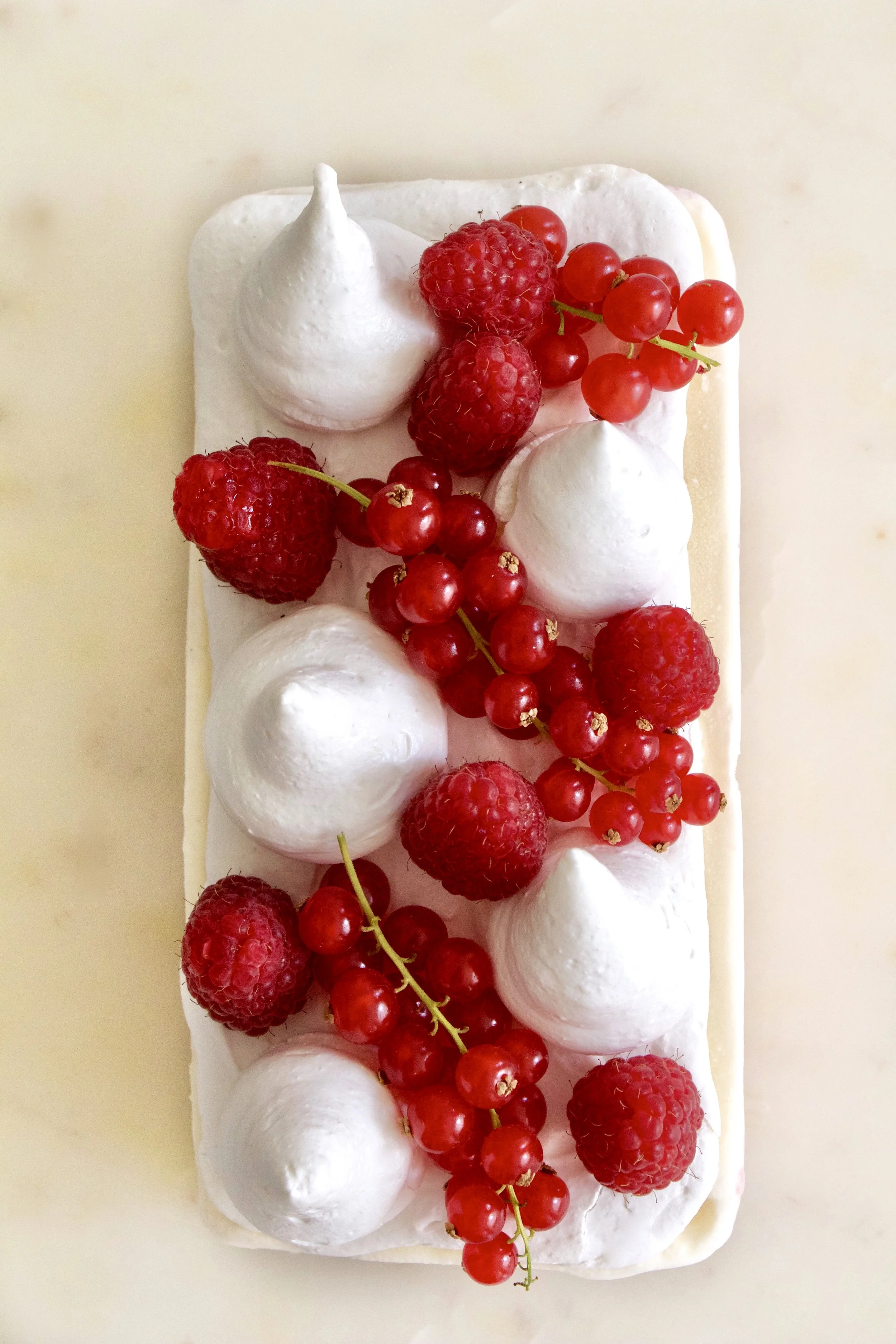 Temperatures have been soaring this summer all across Europe. Here in Paris we are even approaching one of the hottest days on record. Parisians have been keeping cool with iced drinks on shady terraces, window-shopping in air-conditioned department stores and even a few dips in the waters of La Seine. Enter my favorite summertime dessert, vacherin. A vacherin is the perfect treat to make in August with alternating layers of crunchy meringue, creamy vanilla ice cream and tart raspberry sorbet all topped with summer berries.