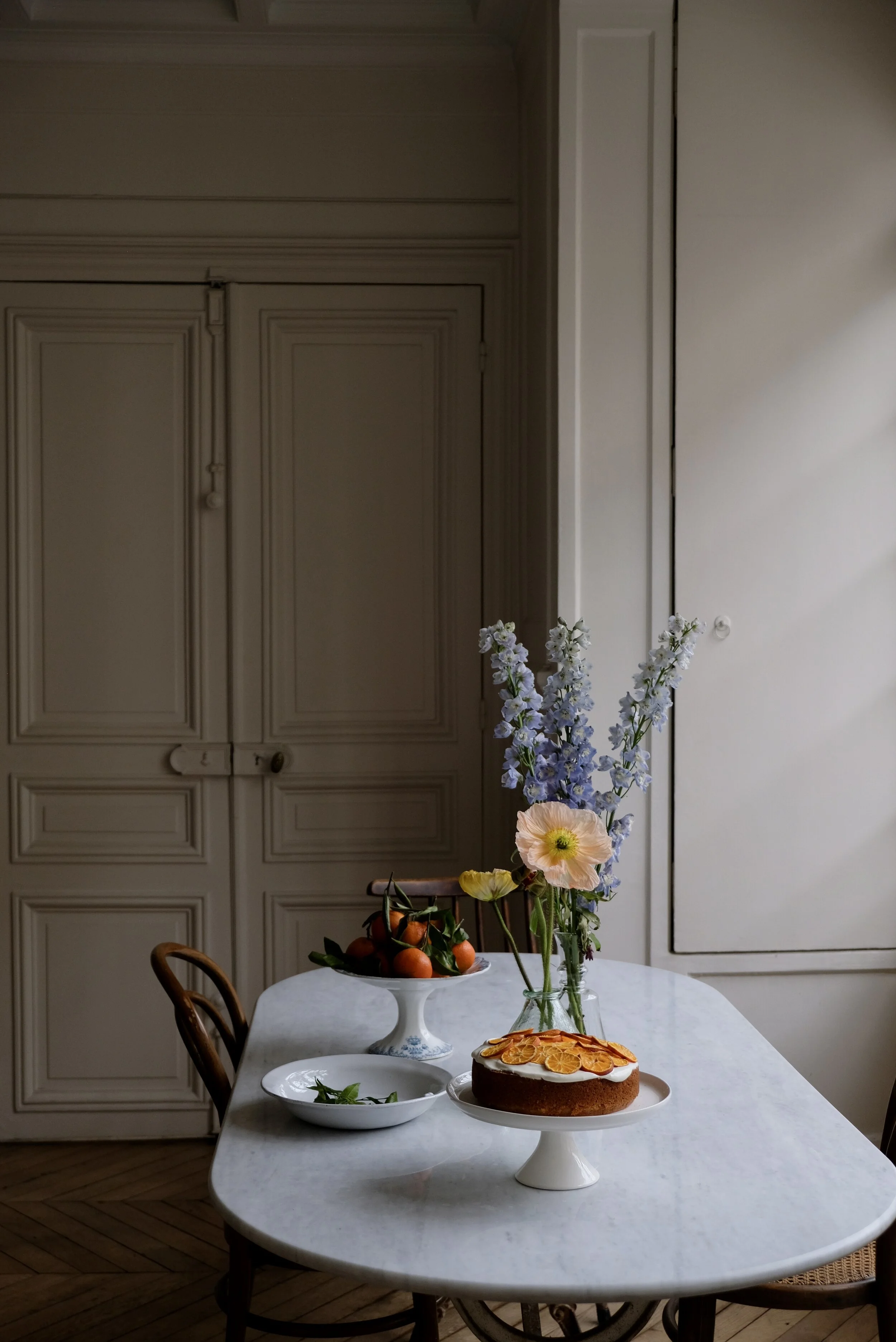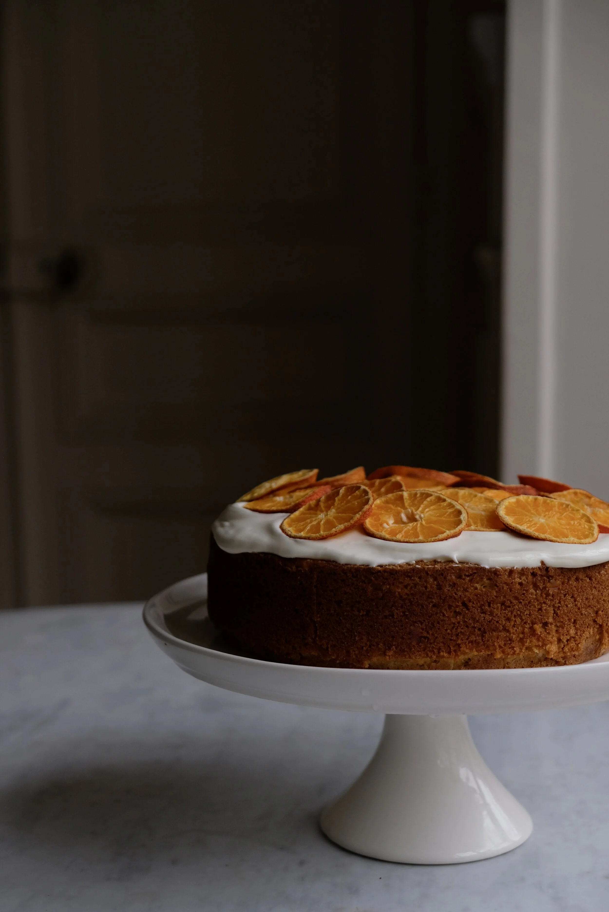 It’s citrus season in France and shiny little orange gems called clementines are overflowing at the markets. The Corsican clementine is France’s only native variety, a cross between the flower of the mandarin tree and the pollen of the orange tree. The season is quite short, November to January, so I find ways to consume these beauties in copious amounts before they disappear for another year. This clementine cake is wonderfully simple and really brightens up a dreary winter day. I like to pair it with a fluffy mascarpone frosting but it can also be served with a simple dusting of icing sugar. The dried clementine rings add color and flair but are optional if you just cant wait to dig into that cake.